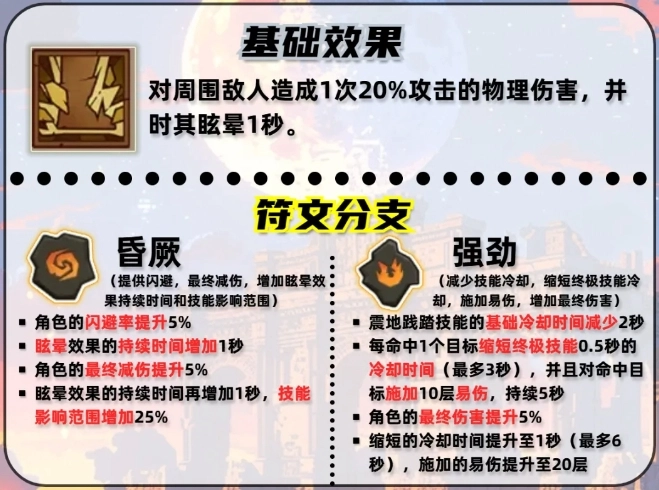 3、携带昏厥符文,能带来减伤与闪避效果,其中橙色符文附加的3秒眩晕,可在竞技场里将未携带免控技能的敌人眩晕;它也能和其他技能及暗能搭配,提升闪避率、降低所受伤害。不过,由于存在提供免控的掌控技能,该技能在工会战与PVP中的功能性相对普通。