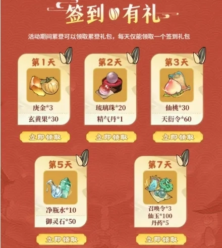首先是签到福利!连续签到第1天、2天、3天、5天、7天各能领取一份资源,累计可获得:庚金3个、玄黄果30个、琉璃珠20个、精气丹1个、仙桃30个、天衍令60个、瓶子10个、御灵石50个、召唤令3个、仙玉100个、丹药5个!不得不说,资源的种类还真不少呢!