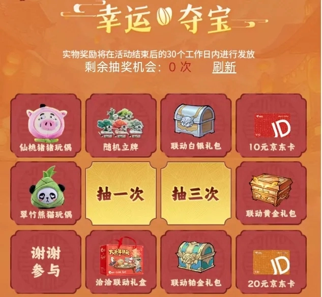 实物奖励包括:仙桃猪猪玩偶、随机立牌、10元京东卡、20元京东卡、洽洽联动礼盒以及翠竹熊猫玩偶。
