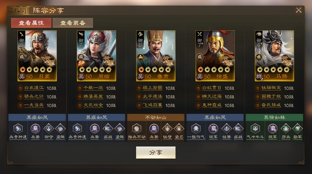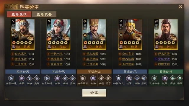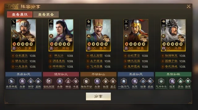 我自己是作为第四队来使用的,装备全靠捡破烂凑。这个队伍最关键的不同点在于吕蒙的技能搭配——用骄兵之计替换了恃功傲宠,这样不仅能提升周瑜的兵刃输出,最大的好处是让徐盛的输出有了明显提高。至于吕蒙带盾兵还是枪兵,就看个人的装备情况来决定了。