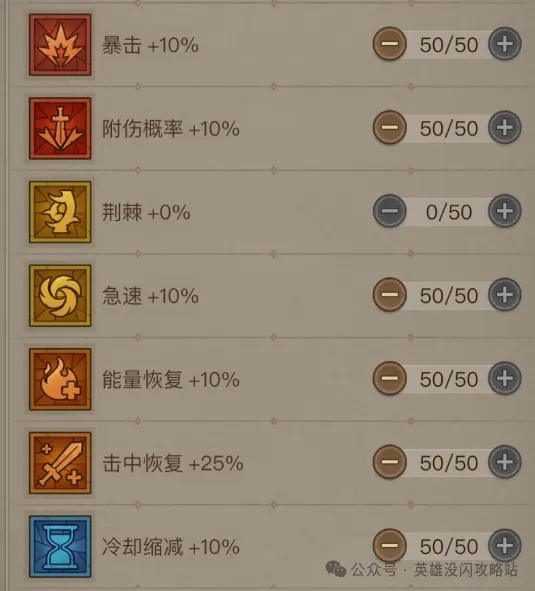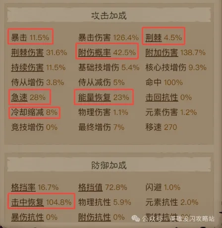加成属性涵盖从暴击到冷却缩减之间的所有属性,每一项属性各自对应角色面板里攻击加成类别下的百分比加成。