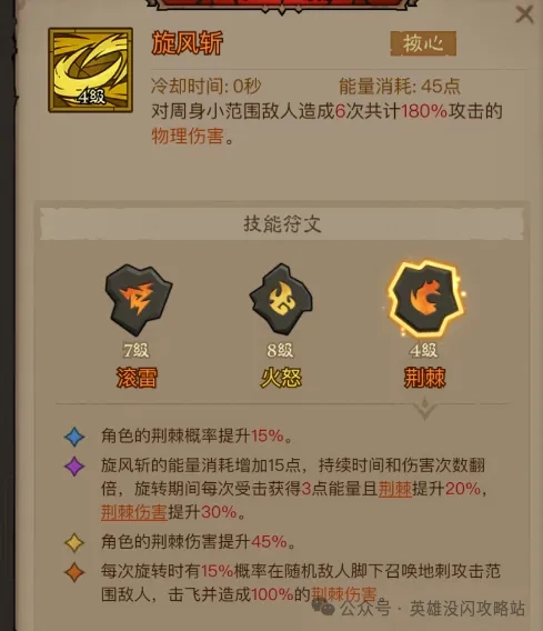 该流派玩法围绕荆棘旋风斩构建核心体系,需将荆棘属性点满以提升荆棘触发概率。