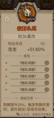 散件流派在佩戴暗能头盔“寂静头冠”来叠加易伤效果时,需要将荆棘属性点满,以此提升荆棘的触发概率,进而叠加易伤。