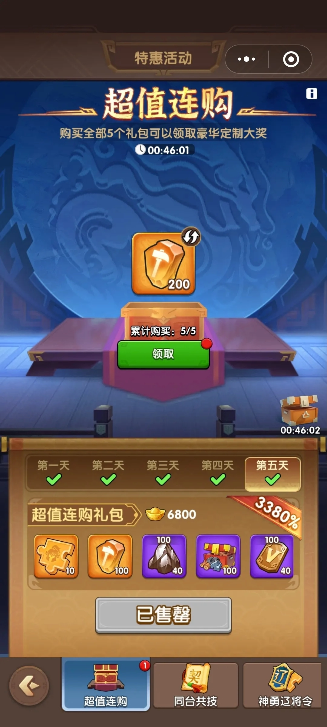 五天总共花费226元,其中包含25个传奇武将通用碎片、50个武将装备高级随机宝箱以及400个锻造石。加速道具可以忽略不计,毕竟九州风采活动中的加速奖励要更多一些。