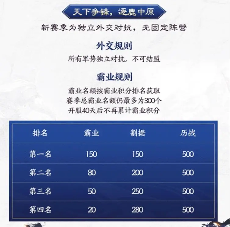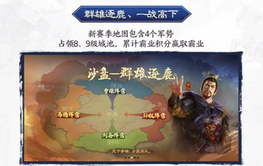 新地图只包含4个军势,且互相不可结盟,占领8、9级城池可累计霸业积分赢取霸业。