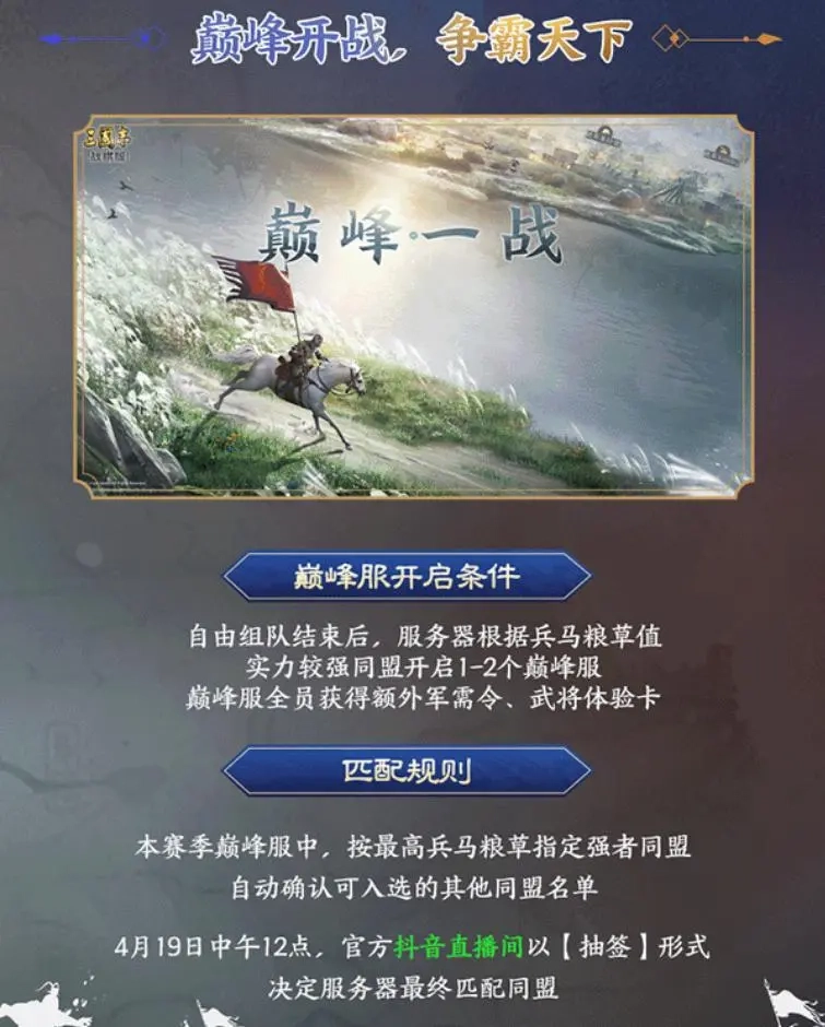 1)一定兵马粮草范围内的同盟采取【随机抽签】形式进行巅峰服匹配,进入即可获得额外奖励