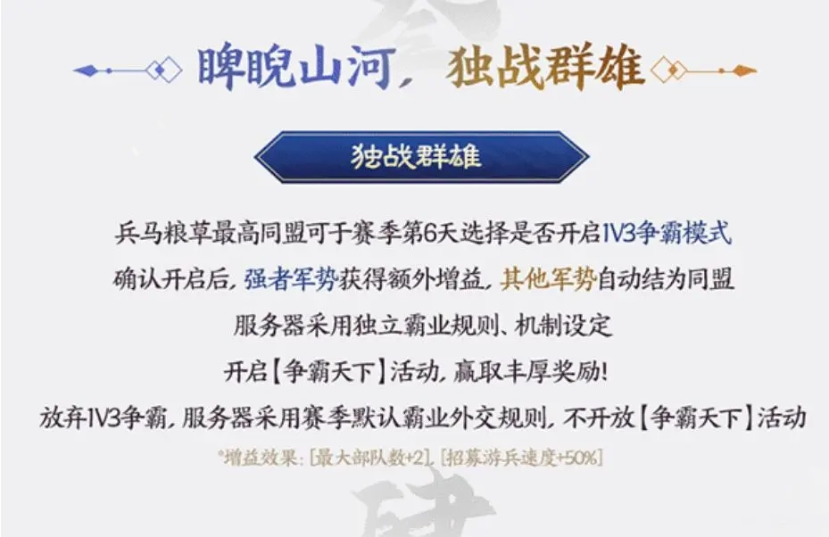 这个巅峰服肯定是选拔实力较强的队伍进入,实力顶尖的盟能够直接以一敌三争夺奖励,从而获得【最大部队数增加2】【游兵招募速度提升50%】的增益效果;要是选择不进行1V3挑战,就会继续使用默认的外交规则。