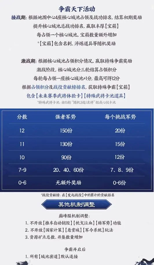 争霸天下活动设有与悬赏城相似的奖励机制,参与者可凭借特定城池的战功排名,获得名刺、淬炼道具、15轮随机三选一武将卡池抽取道具以及未来赛季武将体验卡等奖励。