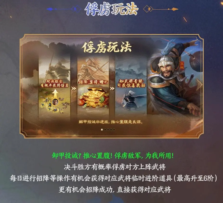 和之前提到的情况差不多,有一定概率俘虏敌方武将,通过招降可以获得临时进阶道具(最多能升到6阶),也就是说即便你是满红状态也能再升一阶,这个玩法挺不错的。