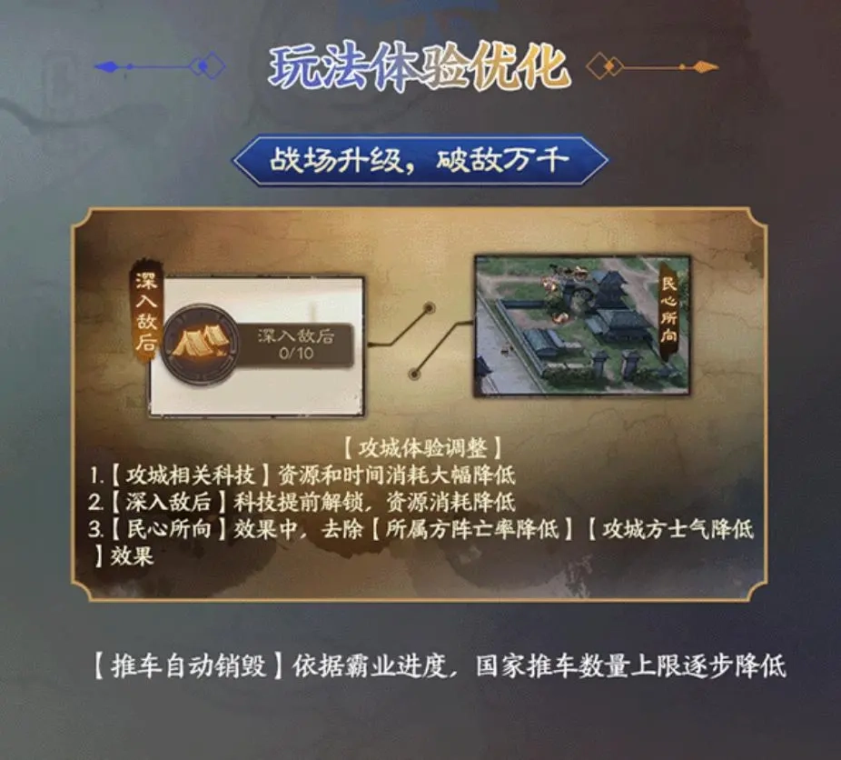 这里的调整都是在降低攻城难度,不仅大幅减少了攻城相关科技和深入敌后所需消耗的资源与时间,还取消了原先民心所向带来的阵亡率降低及敌军士气降低效果,由此可见本赛季是鼓励攻城战斗的。