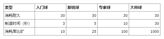 训练师能够使用4种不同的库比球,每制造一个球都会消耗工作台30点耐久值,其余的差异在于制作所需的时间以及库比矿的用量。