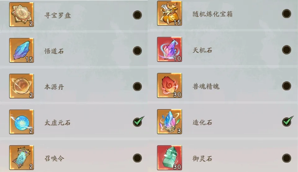 自选道具有两种类型,要是法则没开启至尊法则,飞影建议优先选悟道石;开启了的话,可以选太虚元石去抽玄诀轮回。第二类自选道具,飞影建议选造化石来提升小世界等级,毕竟小世界等级提升也能增加增减伤这类重要属性!