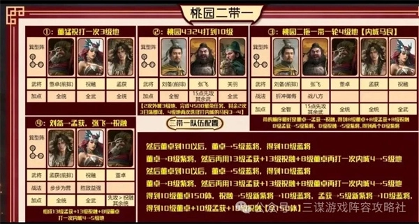 2、桃园二带一策略:先让董卓、孟获组合攻打3级地,之后换上刘备、张飞、关羽组成的桃园队继续推进,待队伍升级后通过武将置换,最终培养出等级在10级左右的董卓、孟获、祝融组合,为后续组建南蛮队奠定基础。