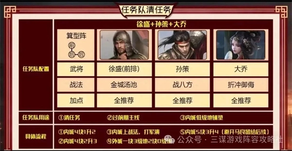 1、任务队执行任务:使用由徐盛、孙策、大乔组成的“孙大圣”队,按照内城升地、参与军演、外城打地的顺序完成任务,遇到马良队时避开,留给后续队伍处理。