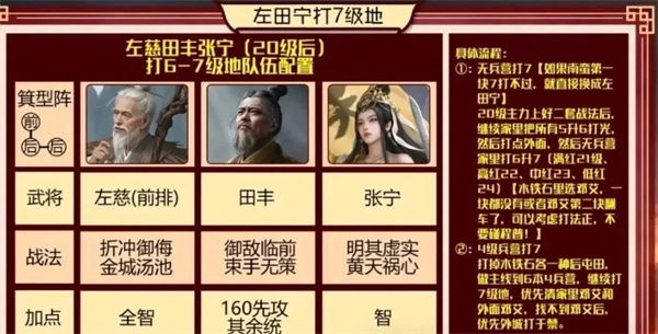 4、左慈、田丰、张宁组合攻打7级地的建议:等级达到20级后组队,可搭配折冲御侮、金城汤池等战法;作战时优先选择内城的邓艾进行攻击,若队伍红度不足,可先攻打外城的于禁。
