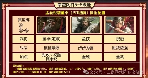 3、南蛮队打5-6级地:董卓带横征暴敛,孟获带步步为营,祝融带胜敌益强,这个组合在16-17级左右就能打内城5-6级地。选地时优先考虑文聘、刘晔这两个守军,如果队伍红度不高,可以先把等级升一级再去尝试。