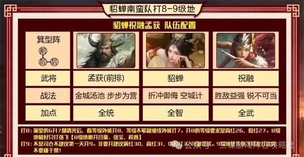 5、貂蝉南蛮队挑战8-9级地的两种配置思路:一是让孟获担任前排,二是让貂蝉担任前排。打8级地时建议优先选择张飞守军;打9级地的话,满红队伍30级、高红队伍31级时可以尝试挑战,同样优先打张飞、徐晃守军,注意避开虞姬守军。