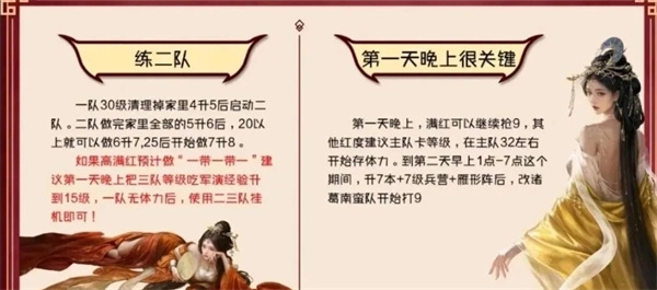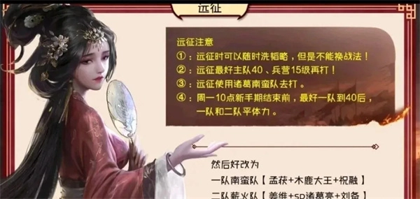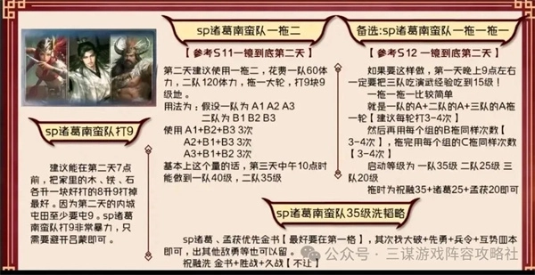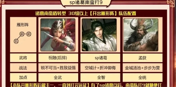 6、sp诸葛南蛮队挑战9级地及后续发展:sp诸葛的加入让南蛮队的实力有所增强,这支队伍还能用来进行一拖二或一拖三的练级模式,35级之后可以洗练战法,远征任务也可以依靠该队伍完成,在新手阶段结束前要尽量把这一队提升到40级。