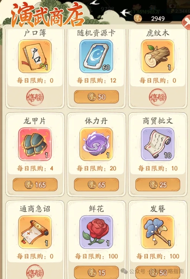 3、演武商店是户口必买的,要优先选择虎纹木,通商方面急需招募人员。