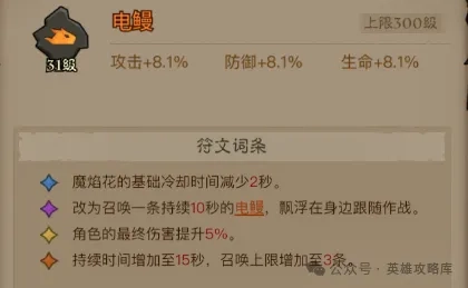 英雄没有闪魔焰花是一个召唤炮台的输出技能,依据符文选择的差异,能带来燃烧或触电层数的额外叠加。“火蕊”符文可增强最终伤害与持续伤害,提供燃烧叠层以及一次击飞效果;“电鳗”符文则能缩短技能冷却时间,提升自身最终伤害,还会把攻击转变为附加触电效果!