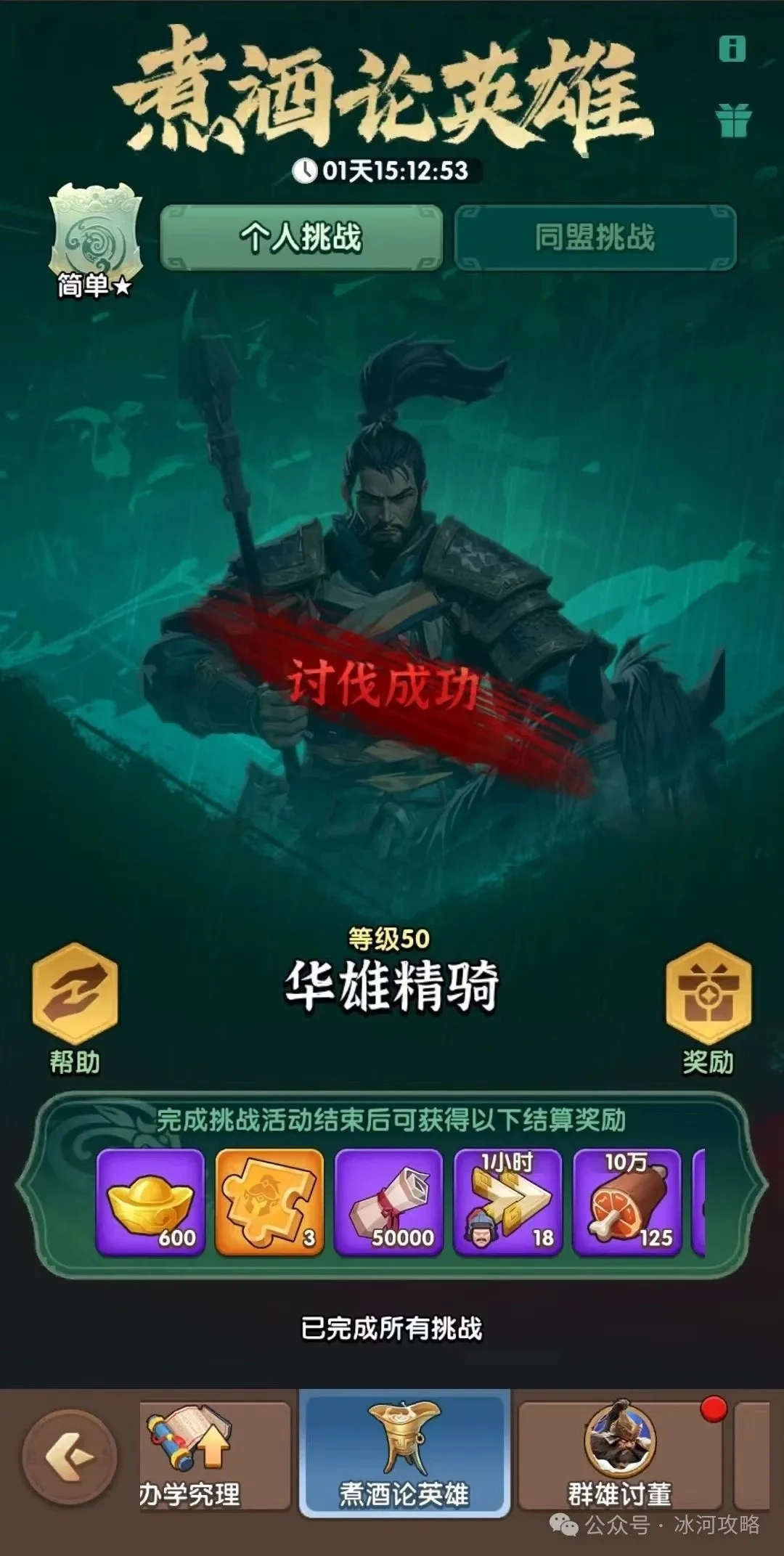 1)你可以挑选适合自己的难度来发起个人挑战,击败的等级越高,最终结算时能拿到的奖励就越丰厚(其中传奇武将通用碎片的数量也会更多)。要是碰到凭一己之力难以讨伐的敌人,你可以向盟友请求帮助,或者召集大家一起集结进攻。要是连集结都打不赢,那下一次挑战时不妨退一步,选择难度低一星的关卡。