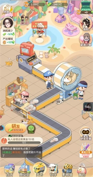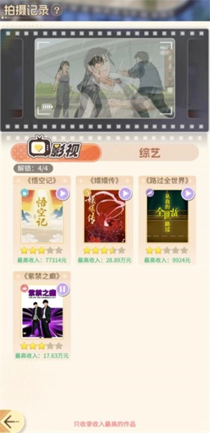 7、想提升收入的话,首先得刷工厂,把店铺和伙伴都升级;其次要完成小游戏,这些小游戏能拿到提成,艺人升级也有提成;私人宴会的排名越高,收入就越多,这和收入榜也有关系;拍电影也能赚钱,前期拍电影收益少是正常现象,提升魅力就能改善;另外店铺最好都升到1000级哦。