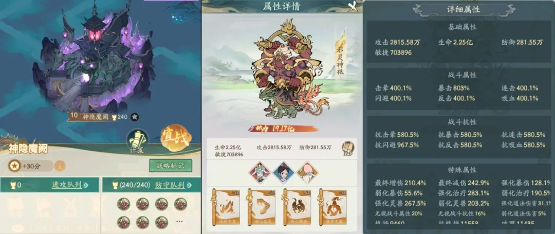 10级城池的怪物是240只邪灵神祇!这怪物的妖力高达19.17亿(不同服务器的妖力数值会有差异),属于暴击型怪物,还具备抗闪避属性!它的增伤数值为210、减伤数值为242,属性方面比9级城池的怪物高出不少!此外,这怪物还带着奶宠乌龟,并且拥有吞灵神通,既有回复能力又有输出能力,伤害不够的道友通常很难将其击败!