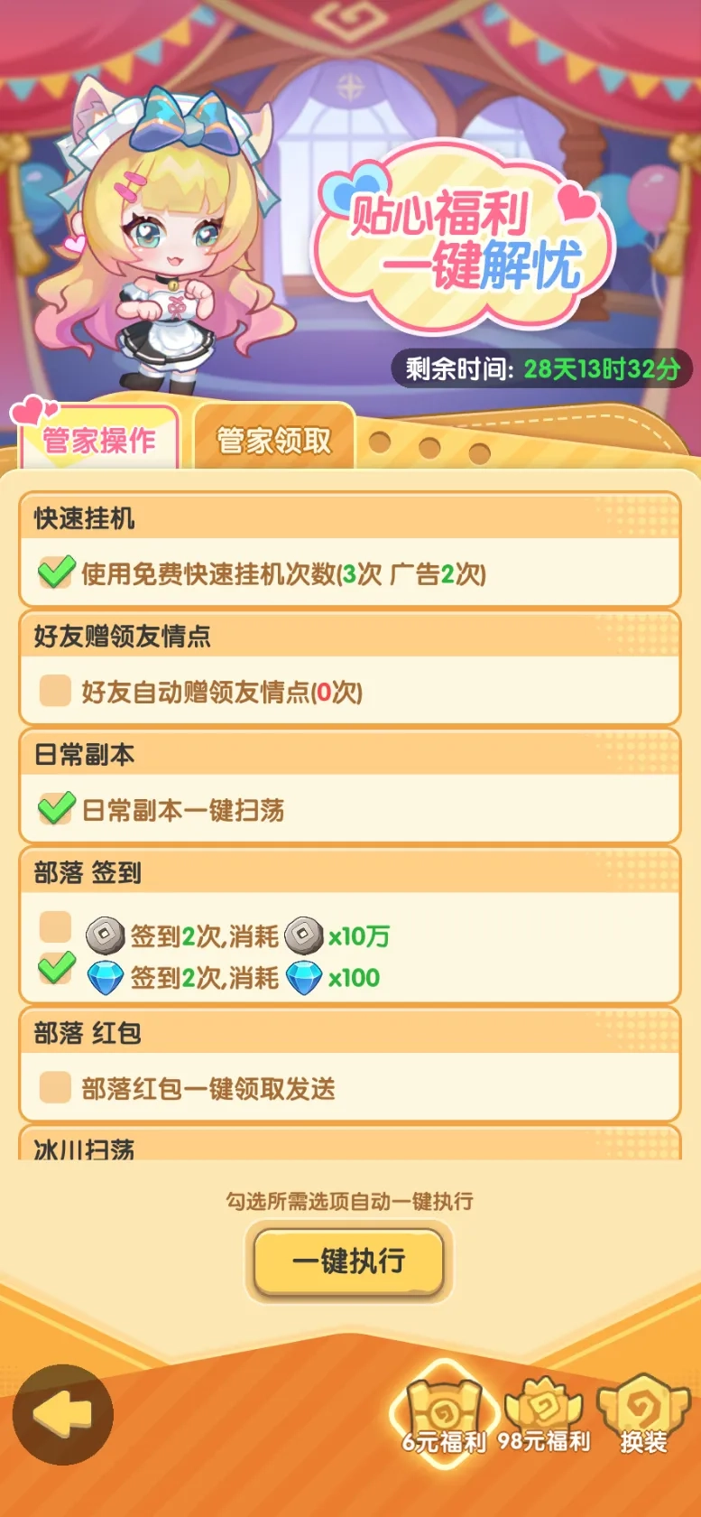 管家系统现已正式上线,由管家小一为您全程贴心守护!解锁专属管家特权后,每日任务完成更轻松,一键操作即可省心搞定,丰厚奖励轻松收入囊中!小一还有更多隐藏超能力,等待各位勇者进入游戏亲自探索哦~