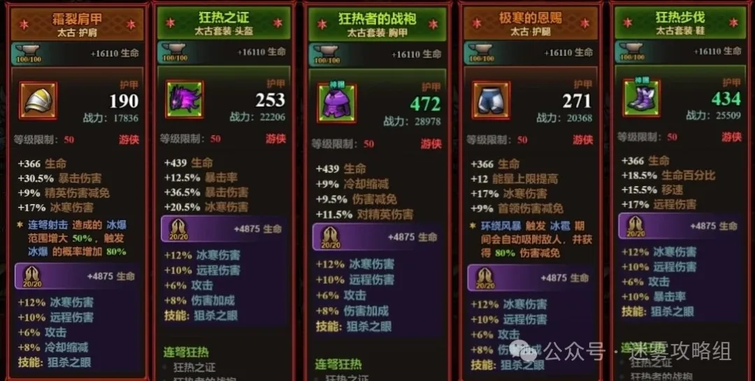 狂热四件套包含头盔、上衣、手套和鞋子,其神铸技能为狙杀之眼,可提供远程伤害加成;流派武器商人的授意效果能增加连弩伤害;圣化武器副手选择瓦罗伦特的箭袋,该箭袋圣化5级附带刺骨效果,能提升单体输出能力,是必备配置;装备词条方面需重点堆叠远程伤害属性。