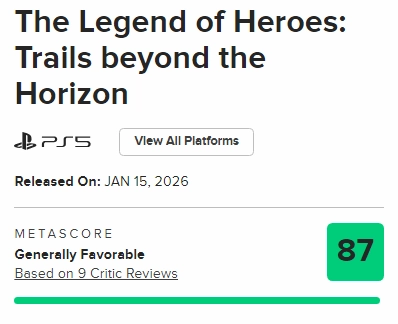 由NIS America负责发行的《英雄传说:界之轨迹》英文版,确定将于1月15日正式推出。目前,游戏媒体评分聚合网站M站已公布该版本的媒体平均分,成绩为87分。据统计,在消息发布时,已有9家媒体完成了对这款游戏的评测工作。