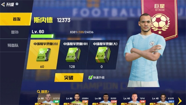 1、升级:球员养成最基础的方式,通过消耗对应位置的教学录像带(俗称“盒饭”)来提升等级,等级越高,球员的基础属性就越强。球员等级划分为职业、球星、超级球星、巨星、超级巨星、世界巨星、历史巨星这几个阶段,每个阶段达到等级上限后,必须进行突破才能继续升级。前期建议优先升级主力核心球员,替补球员的等级只要能满足主线任务需求就行,不用把所有球员的等级都拉满,避免浪费经验道具。
