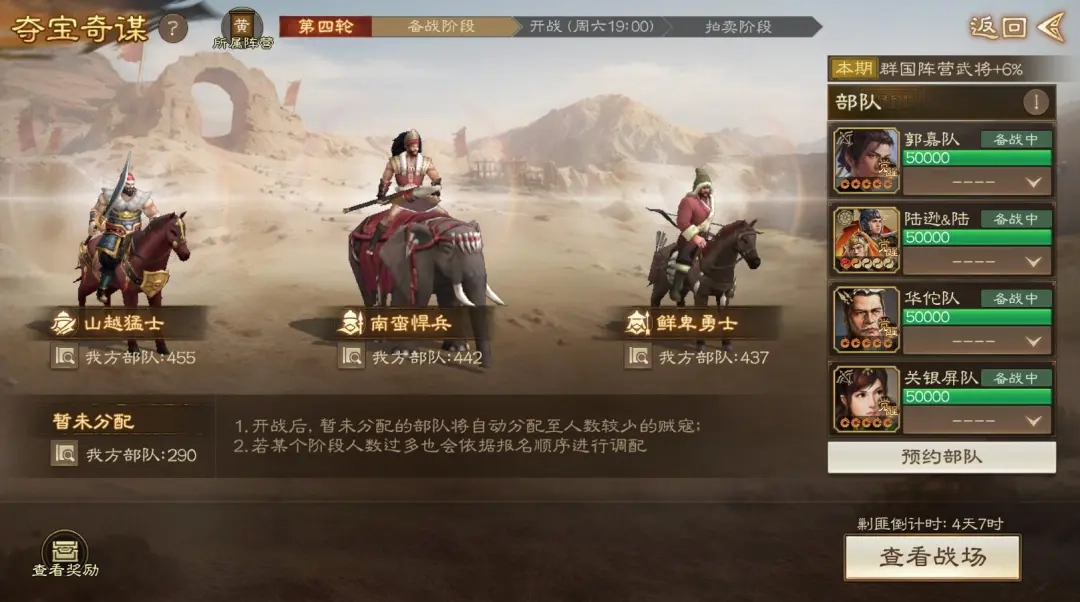 而且,这个阶段还有贼寇给的预备兵,将贼寇的预备兵用在前面四个强度更高的队伍,让他们更快复活,打更多战功更有性价比。