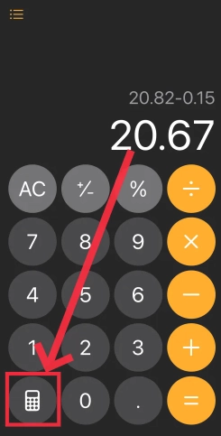 1. 苹果手机用户在桌面找到系统自带的计算器应用并打开,接着点击计算器界面左下角的计算器图标。