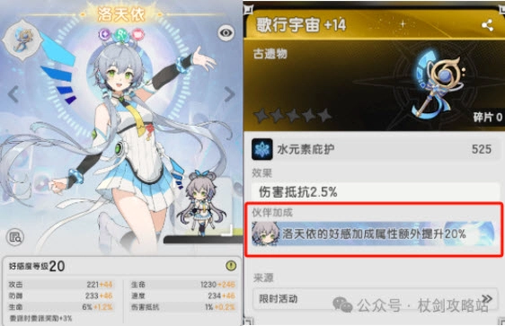 没错,你没看错,这个遗物能让联动伙伴洛天依的好感度加成属性额外提升20%。光这么说或许不够直观,下面附上图片: