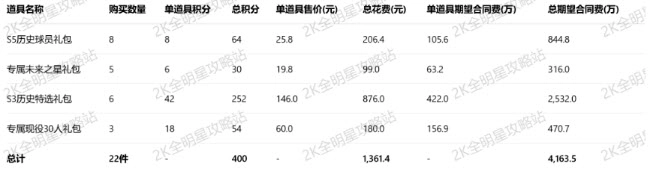 这里给大家分享一个累计积分达400的购物策略,当积分满400时,至少能额外获得326W合同费!总共支出1361.4元!加上附赠的礼包,整体预期合同费大概在4000万上下,期望比例约为1:3!