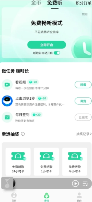 领取时长币(通常听满30分钟就能完成三个任务,还能通过看几个广告额外领取一些),领完后去下方参与抽奖,一般都能抽到半小时的奖励,不过我也有过一次抽到24小时的经历。