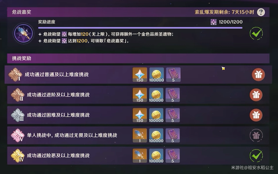 2、前三个难度的玩法可以简单理解为消耗体力刷圣遗物,其中难度3的水平等同于满级圣遗物本,并且每消耗120体力会额外获得一个5星圣遗物(没有数量限制),整体效率比直接刷对应的圣遗物本更高。如果偏好联机刷本,还能解决冷门本没人组队的问题——因为刷完本后掉落的圣遗物种类可以自主选择,每个人的掉落都是独立的。