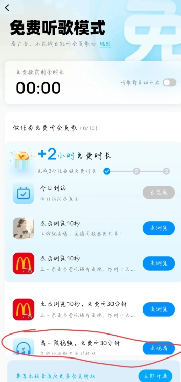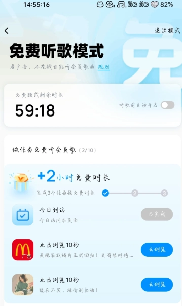 3.在图三中选择并完成任务,即可获得免费听歌时长。