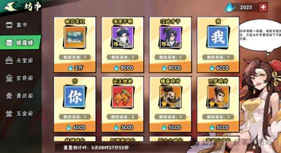 2、银霜楼:每周购买两个红色秘籍卷轴,资源充足时可购买皮肤和“字”。