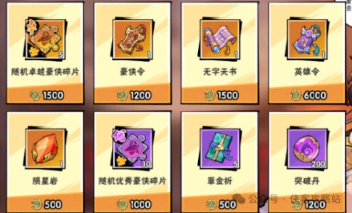 1、集市:优先选购折扣在5折及以下的豪侠令、英雄令,5折的突破丹、6折的无字天书,还有所有能使用金币购买的道具。