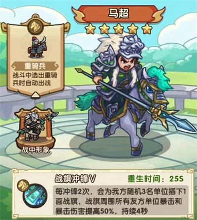 2、马超,要是你总因为输出不够而卡在关卡过不去,那马超肯定是你不能错过的角色。他能明显拉高阵容的整体强度上限,搭配吸血类的卡牌或者宝物来增强生存能力后,只要马超在场上,战旗效果差不多能覆盖整个战斗过程。经过战旗强化的兵种很容易达到接近满暴击的状态,还能联动触发暴击百分比追加的宝石,或者是卡牌、宝物之类的效果,实现“左脚踩右脚”式的战力飞升。
