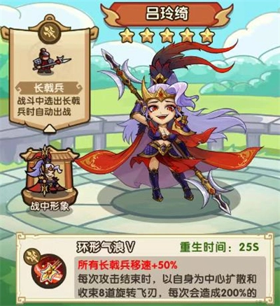 1、吕玲绮,她的技能与长戟兵的输出模式适配度很高。长戟兵完成一轮攻击后,会进入短暂的停滞状态,这时的长戟兵既没有输出能力,还极易被击败。而吕玲绮在攻击结束后,飞刃依然能持续造成伤害,并且带有秒杀效果,清理群体怪物的效率非常高。当吕玲绮达到三星后,还会获得易伤效果。易伤属于珍贵的独立乘区,和卡牌、宝石等带来的伤害增加效果相互独立,不会出现效果稀释的情况。