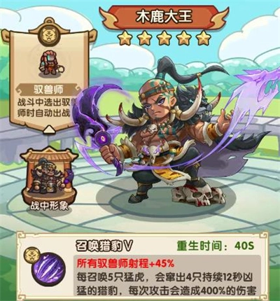 2、木鹿大王,他的技能可以召唤出猎豹,这可是相当强力的召唤物。猎豹自带连击效果,能让伤害翻倍,而且还能附加秒杀效果。等木鹿大王升到3级后,还能给召唤物增加攻速和伤害,让召唤物的输出能力得到很大提升。这里有一套经典的玩法推荐:先选出猛虎成群、召唤战鹰、飞熊军这三张前置牌,然后再点出猛兽狂暴,这样能大大增强猎豹的刷新速度和连击效果的强度。这套玩法会在木鹿大王3级时发生质变,有了攻速加持,猛兽的输出就能轻松超过全场其他单位。