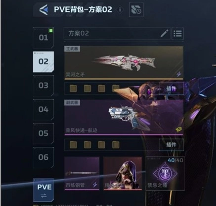 所以这里2号插件和纯白存在区别,冥河之矛搭配2号插件时要选择真空回涌,不要无限续子弹,得等子弹打空、触发换弹动作,并且能量已经上涨后,直接用乘风技能打断换弹动作继续输出。一定要等子弹打空且能量恢复后再使用乘风,这样基本21秒就能完成充能,实现21秒一个大招。另外,4号插件要带专属插件。