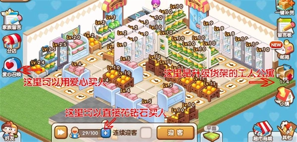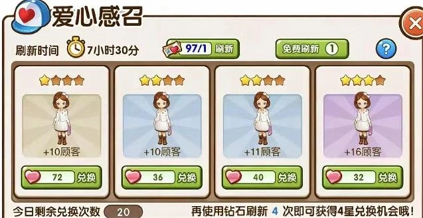 2、超市每日接待顾客需要消耗迎客次数,获取方式有三种:第一种是系统倒计时自动恢复,每5分钟增加1次迎客次数,上限会随着超市口碑等级的提升而提高,达到上限后倒计时将不再增加次数;第二种是使用钻石购买,消耗一定数量的钻石就能补充迎客次数;第三种是爱心召唤,在超市场景中点击爱心召唤按钮,即可用爱心召唤顾客,每日最多20次,建议优先兑换3星、4星顾客,若想完成20次召唤,2星顾客也可以兑换。