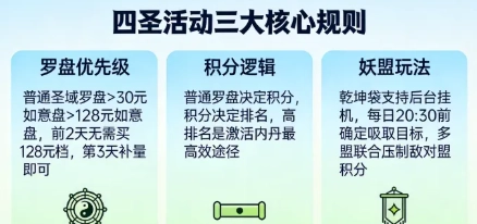 1、四圣活动的核心产出是珍稀红内丹和内丹相关道具,对于尚未开放内丹系统的新区,建议减少投入;本次活动还叠加了累充福利,大家在充值前可以先明确优先级。