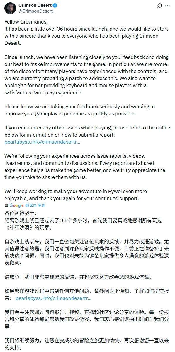 推文中提到:“我们特别留意到不少玩家在操作过程中感到不适应,目前正着手准备补丁来处理这一问题。另外,我们也为没能给键盘和鼠标玩家带来理想的游戏体验致歉。”