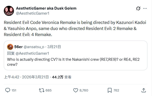 长期专注于《生化危机》系列爆料的知名“舅舅党”Dusk Golem近日发布推文称:“《生化危机:代号维罗妮卡 重制版》将由门井一宪与安保康弘共同执导,这两位导演曾负责《生化危机2:重制版》和《生化危机4:重制版》的创作。”