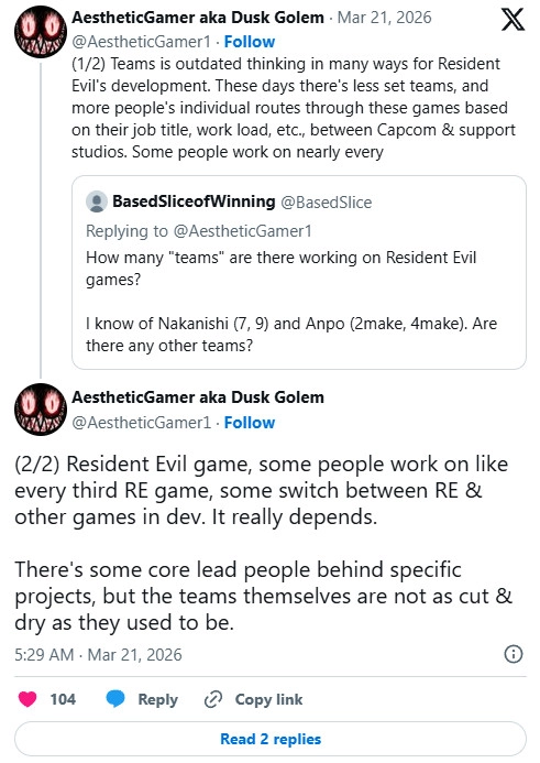 在回应《生化危机》系列目前有多少开发团队这一问题时,Dusk Golem称“固定团队”的思路对该系列而言已经过时。他表示,如今卡普空及其合作的辅助工作室不再采用固定团队模式,而是根据员工的岗位、负责的工作量等具体情况,让他们分别参与不同游戏项目的开发工作。