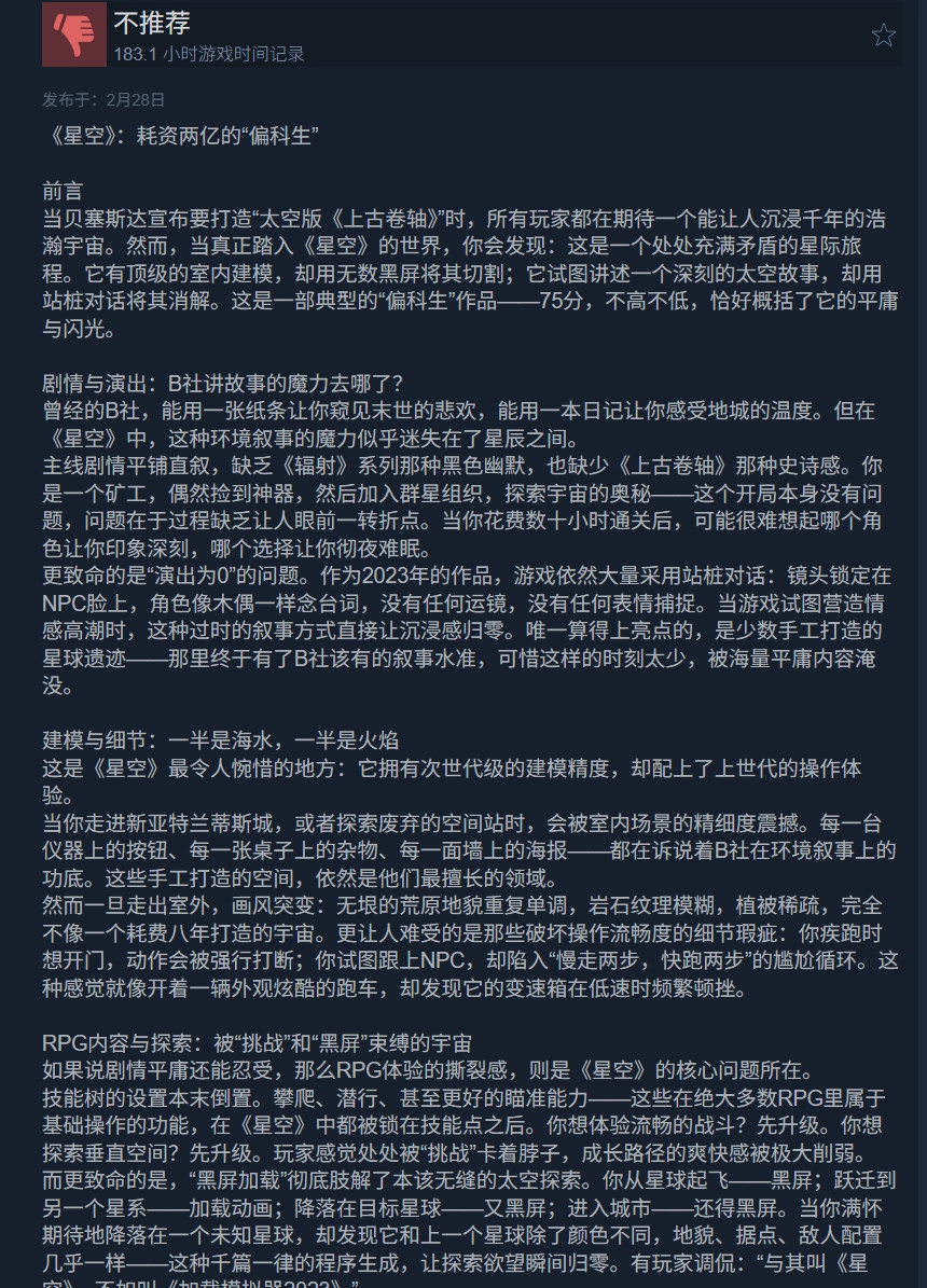 与此同时,《星空》在发售两年多后,Steam平台上的整体评价依旧处于“褒贬不一”的状态,连“多半好评”的标准都没能达到。在总计11万1753条评论里,好评率仅为58%。而简体中文评论区的情况更不乐观,好评率只有51%。
